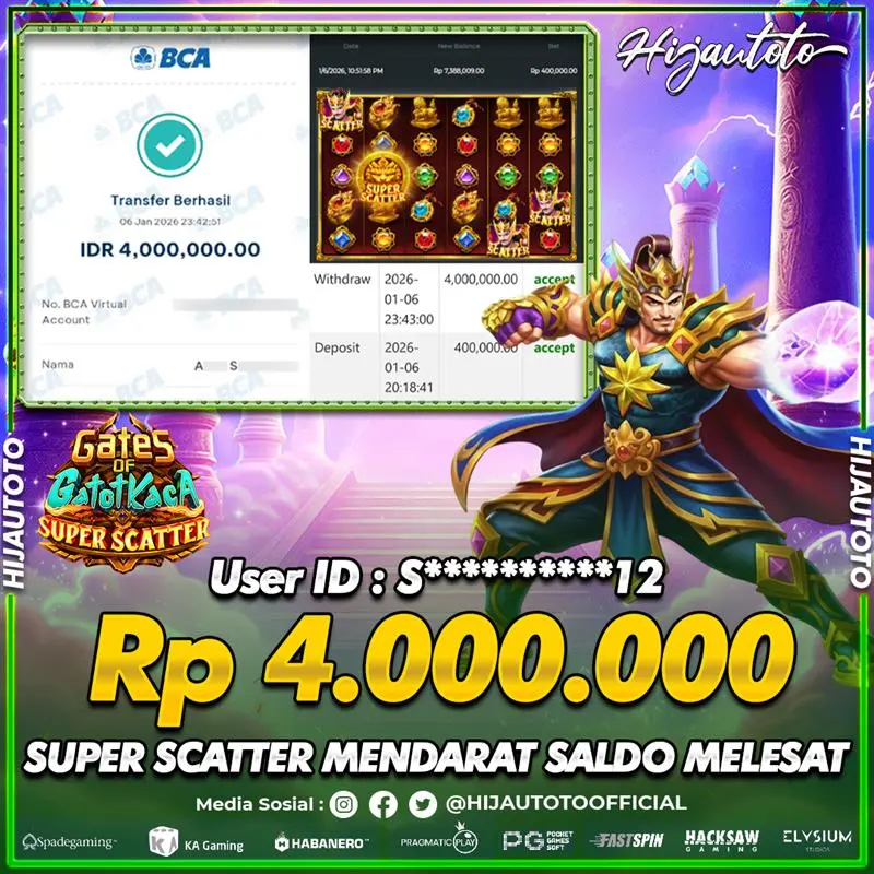 Selamat Kepada Member HIJAUTOTO S**********12 Telah Jackpot Di SLOT GATES OF GATOT KACA SUPER SCATTER