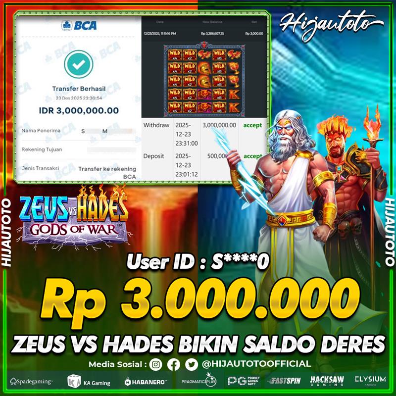 Selamat Kepada Member HIJAUTOTO S****0 Telah Jackpot Di SLOT ZEUS VS HADES GODS OF WAR