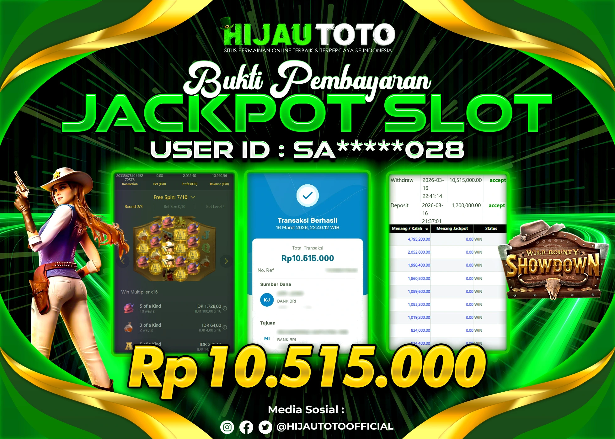 Selamat Kepada Member HIJAUTOTO SA*****028 Telah Jackpot Di SLOT WILD BOUNTY SHOWDOWN