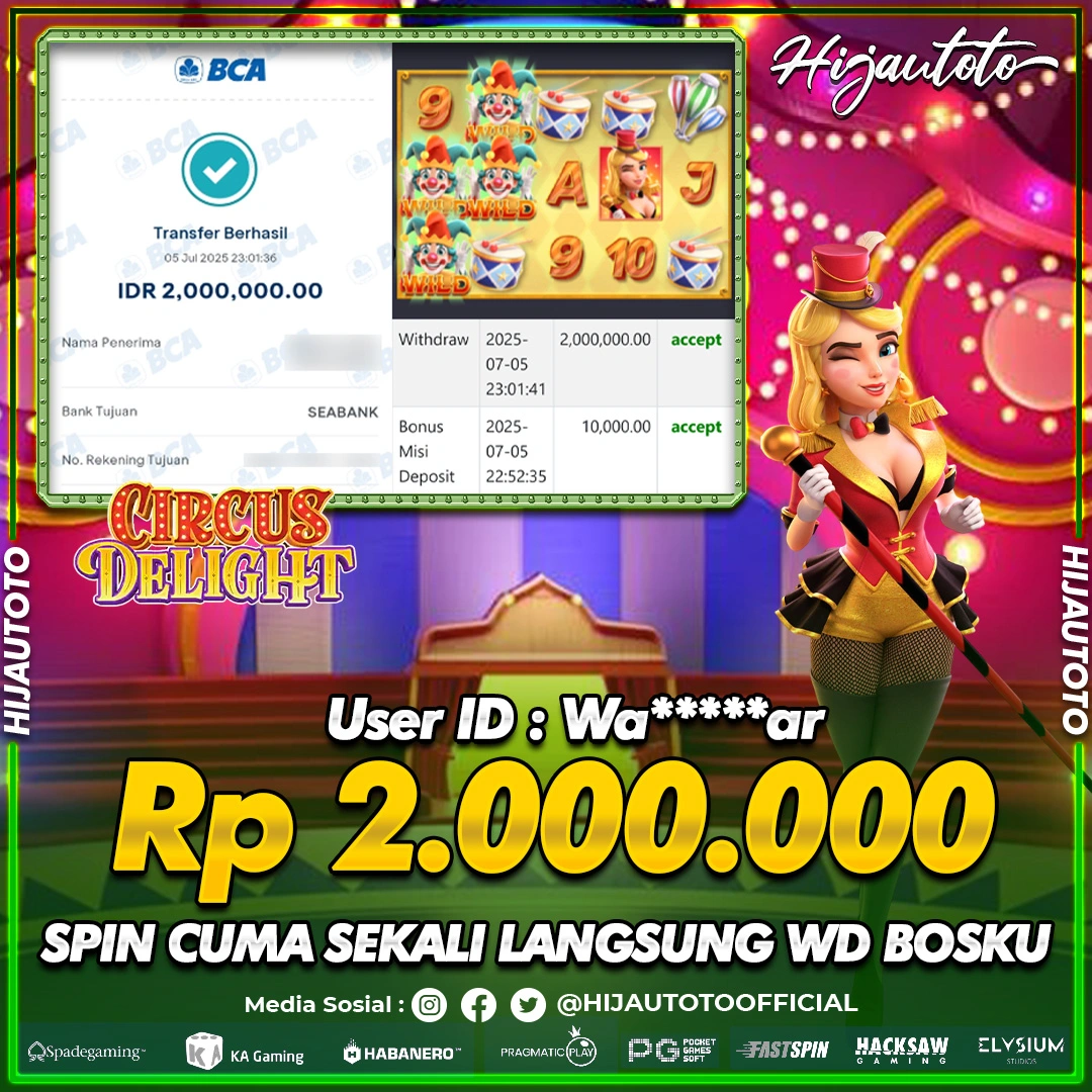 Selamat Kepada Member HIJAUTOTO WE*****AR Telah Jackpot Di SLOT CIRCUS DELIGHT