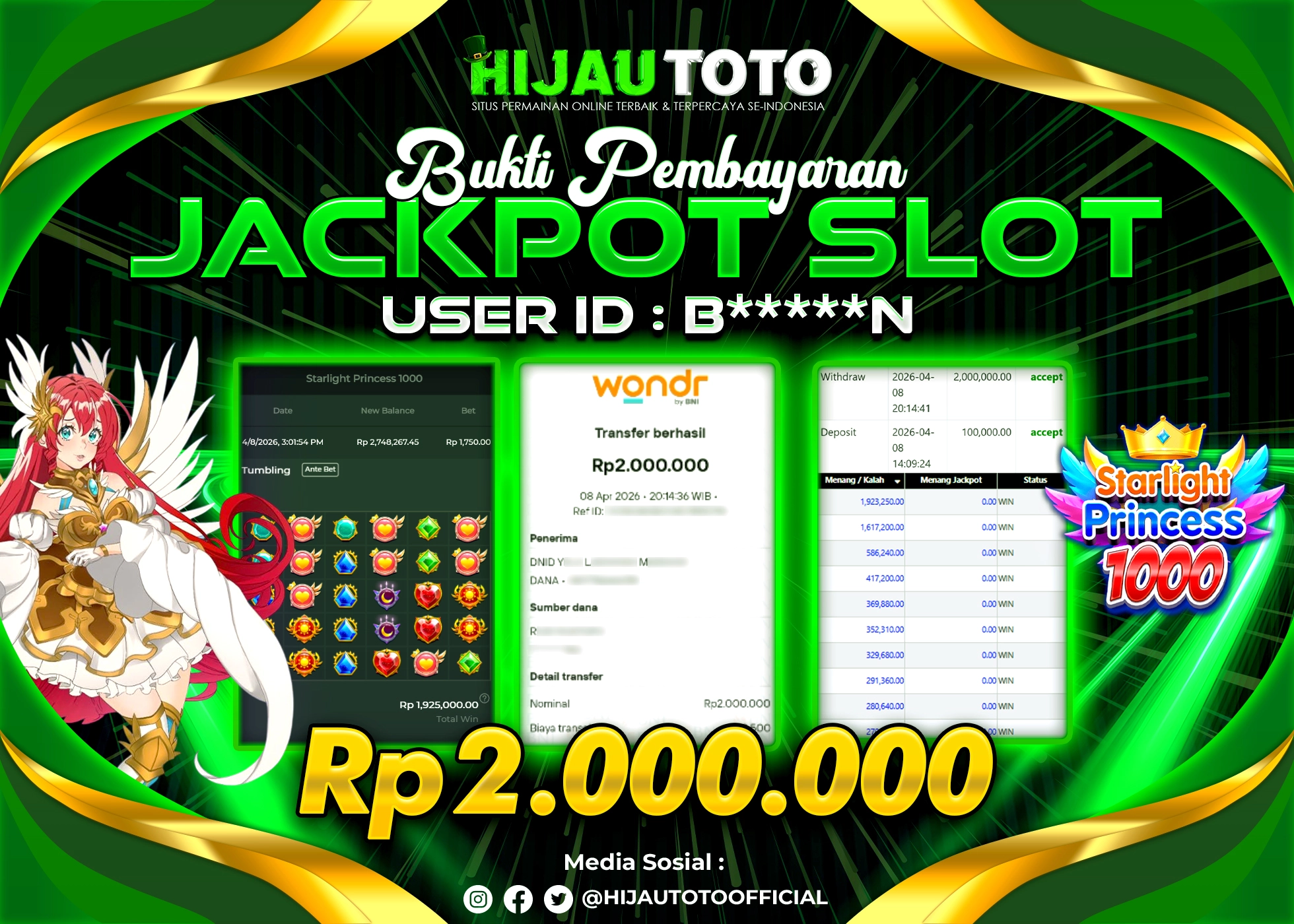 Selamat Kepada Member HIJAUTOTO B*****N Telah Jackpot Di SLOT STARLIGHT PRINCESS 1000