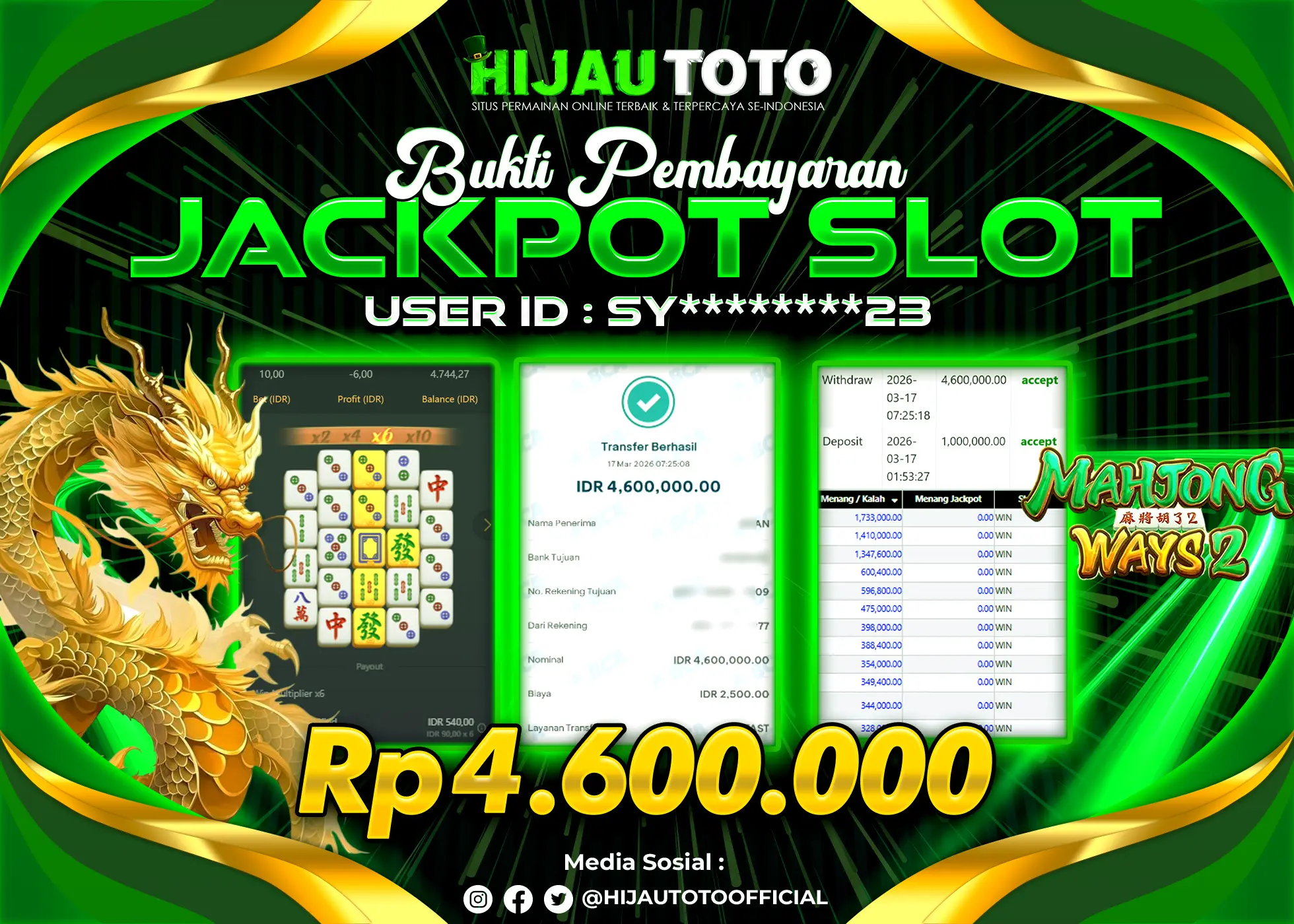 Bergabung dengan HIJAUTOTO sangat mudah dan cepat. Cukup lakukan pendaftaran dengan data lengkap, lakukan deposit minimal Rp5.000 melalui berbagai metode termasuk QRIS, dan mulai bertaruh dengan minimal taruhan Rp100. Dapatkan juga bonus new member 100% untuk modal bermain lebih besar.