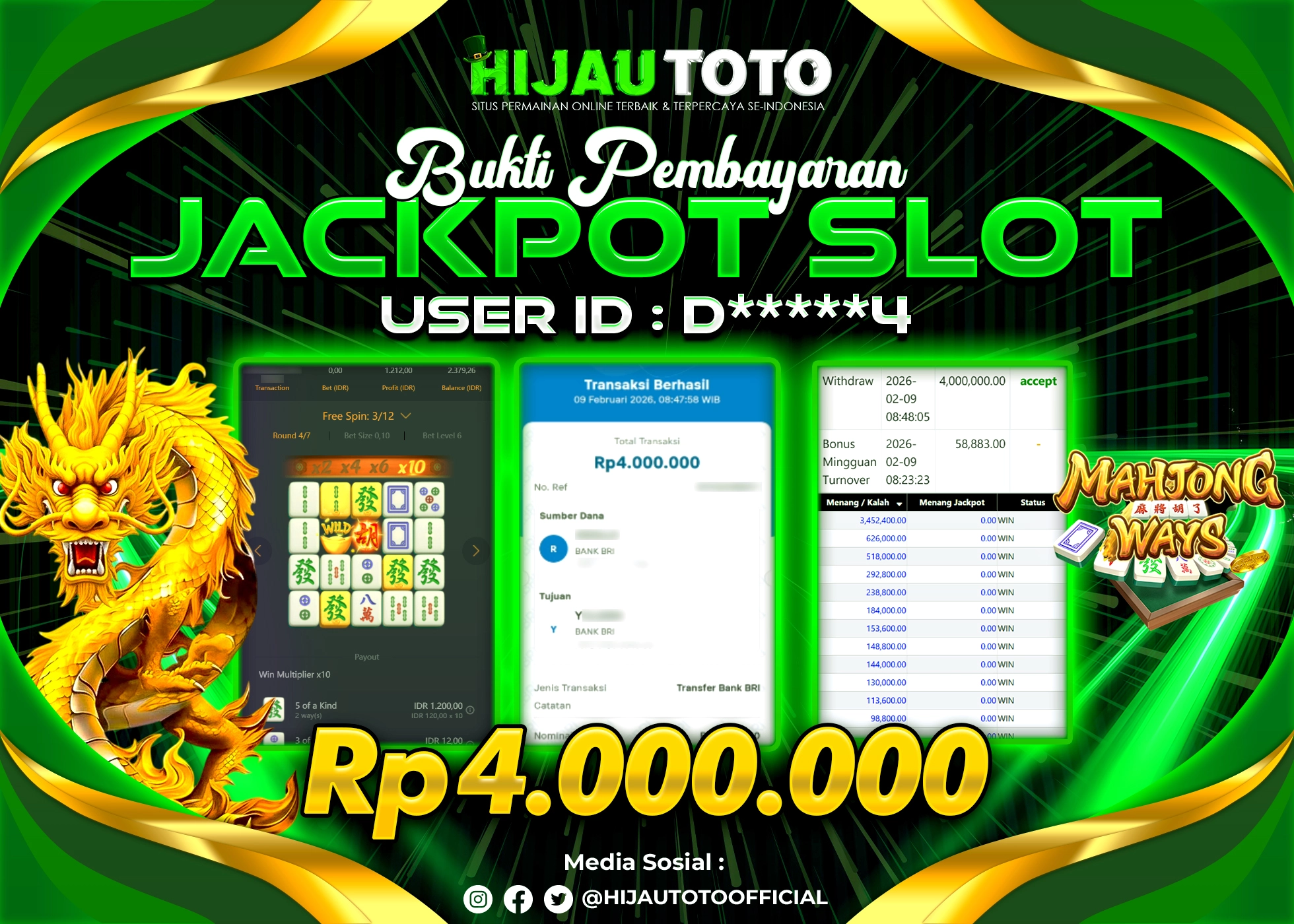 Bergabung dengan HIJAUTOTO sangat mudah dan cepat. Cukup lakukan pendaftaran dengan data lengkap, lakukan deposit minimal Rp5.000 melalui berbagai metode termasuk QRIS, dan mulai bertaruh dengan minimal taruhan Rp100. Dapatkan juga bonus new member 100% untuk modal bermain lebih besar.