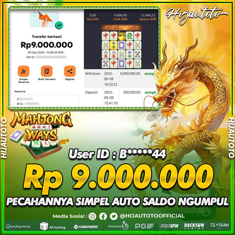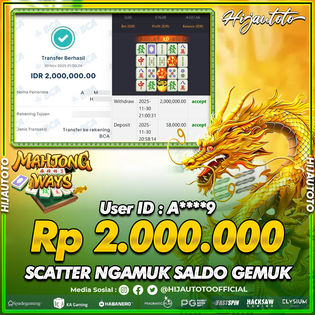 Selamat Kepada Member HIJAUTOTO A****9 Telah Jackpot Di SLOT MAHJONG WAYS