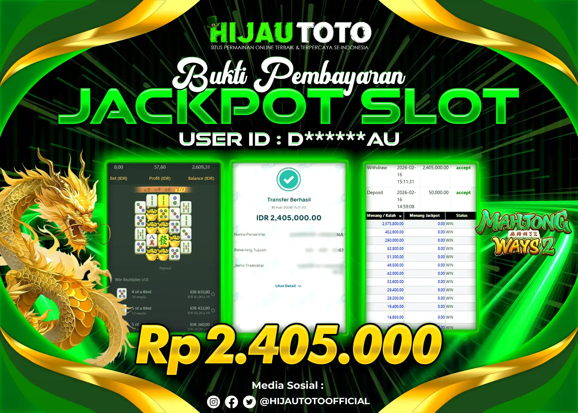Selamat datang di HIJAUTOTO, tempatnya seru-seruan dan cuan besar! Mulai main cukup dengan modal Rp5.000 aja, taruhan super murah dari Rp100 perak! Mau main slot yang penuh warna? Atau togel dari 20 pasaran paling hits? Atau mungkin tembak ikan yang bikin deg-degan? Tenang, ada juga taruhan bola, sabung ayam, dan live casino yang bikin suasana makin hidup! Daftar sekarang dan dapetin bonus new member 100% langsung, biar modalmu makin tebal. Deposit gampang banget, bisa pakai QRIS, dan kalau butuh bantuan, customer service kita siap 24 jam nonstop. Jadi, tunggu apa lagi? Yuk, gabung dan bawa pulang kemenangannya cuma di HIJAUTOTO!