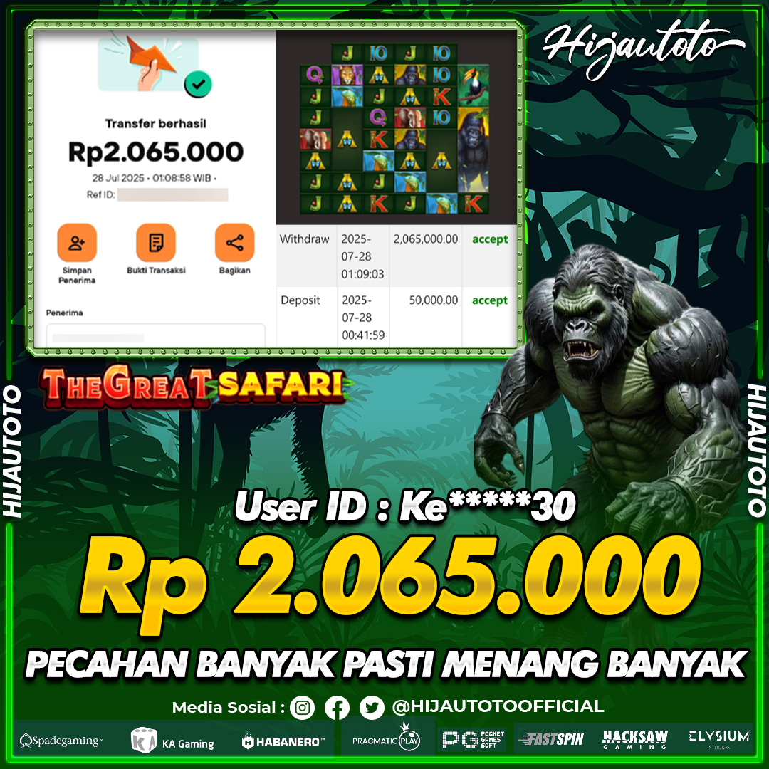 Selamat Kepada Member HIJAUTOTO KE*****30 Telah Jackpot Di SLOT THE GREAT SAFARI