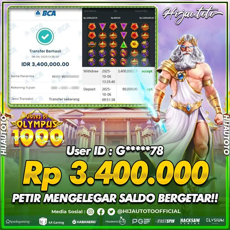 Selamat Kepada Member HIJAUTOTO G*****78 Telah Jackpot Di SLOT GATES OF OLYMPUS 1000