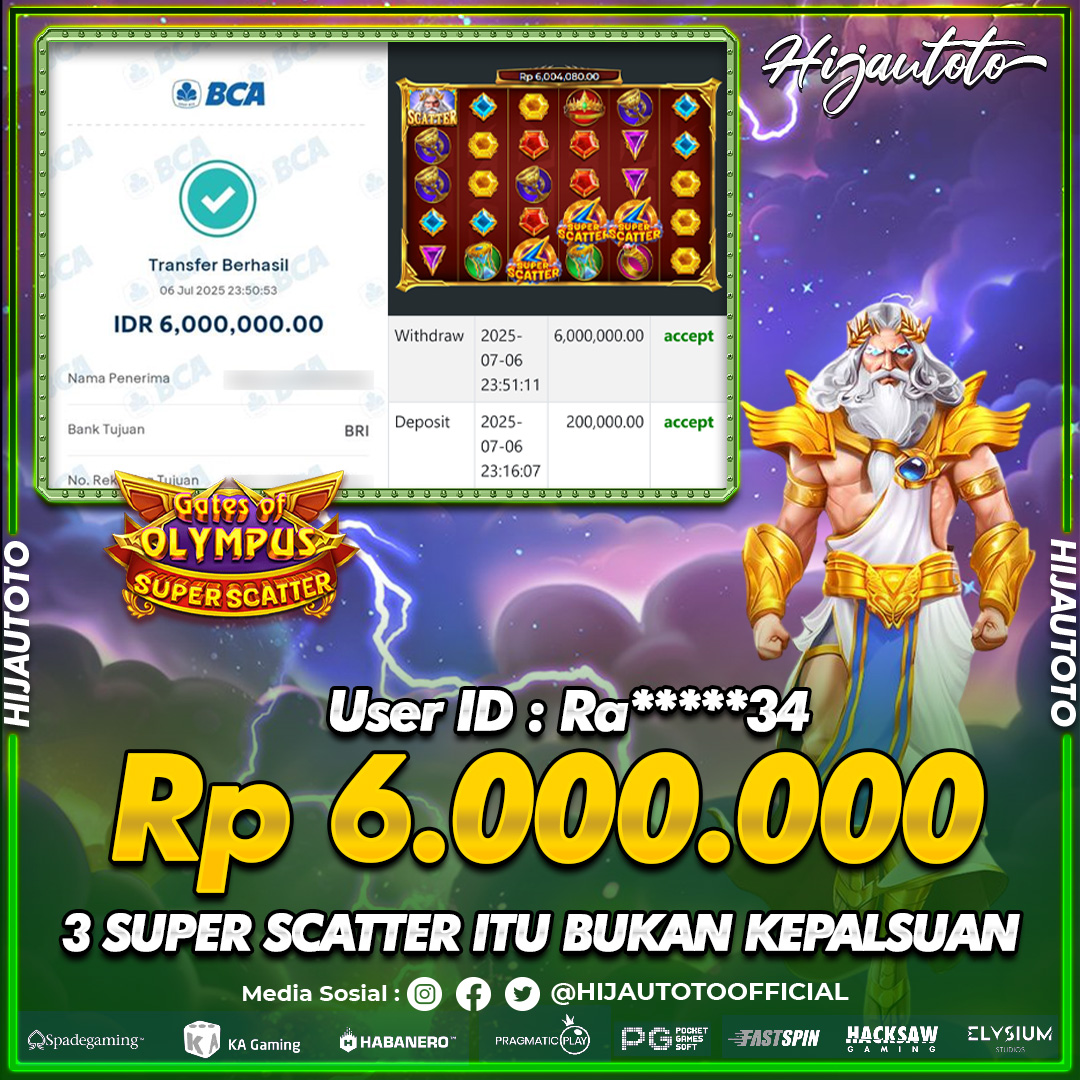 Selamat Kepada Member HIJAUTOTO RA*****34 Telah Jackpot Di SLOT GATES OF OLYMPUS SUPER SCATTER