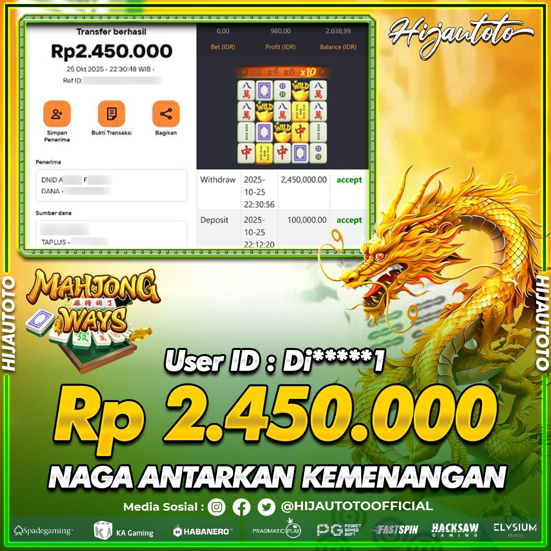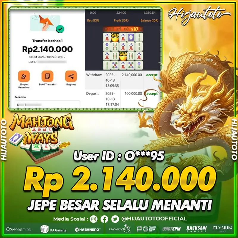 Selamat Kepada Member HIJAUTOTO O****5 Telah Jackpot Di SLOT MAHJONG WAYS