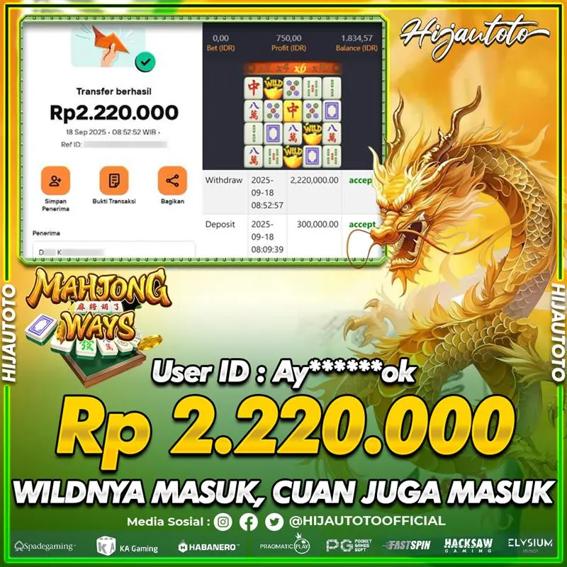 Selamat Kepada Member HIJAUTOTO E****R Telah Jackpot Di SLOT MAHJONG WAYS