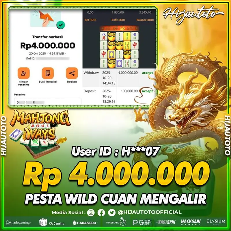Selamat Kepada Member HIJAUTOTO C******99 Telah Jackpot Di SLOT MAHJONG WAYS
