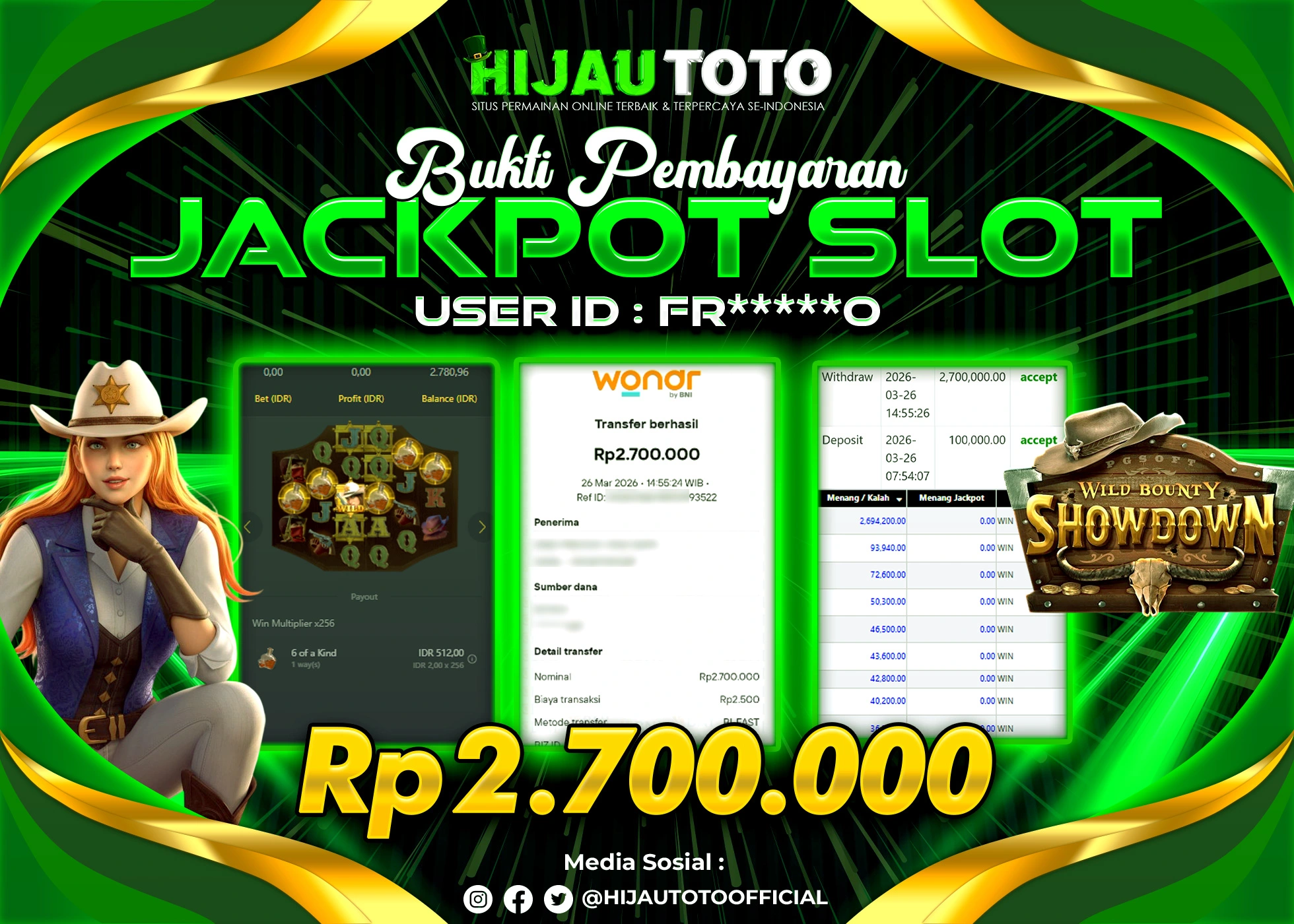 Selamat Kepada Member HIJAUTOTO FR*****0 Telah Jackpot Di SLOT WILD BOUNTY SHOWDOWN