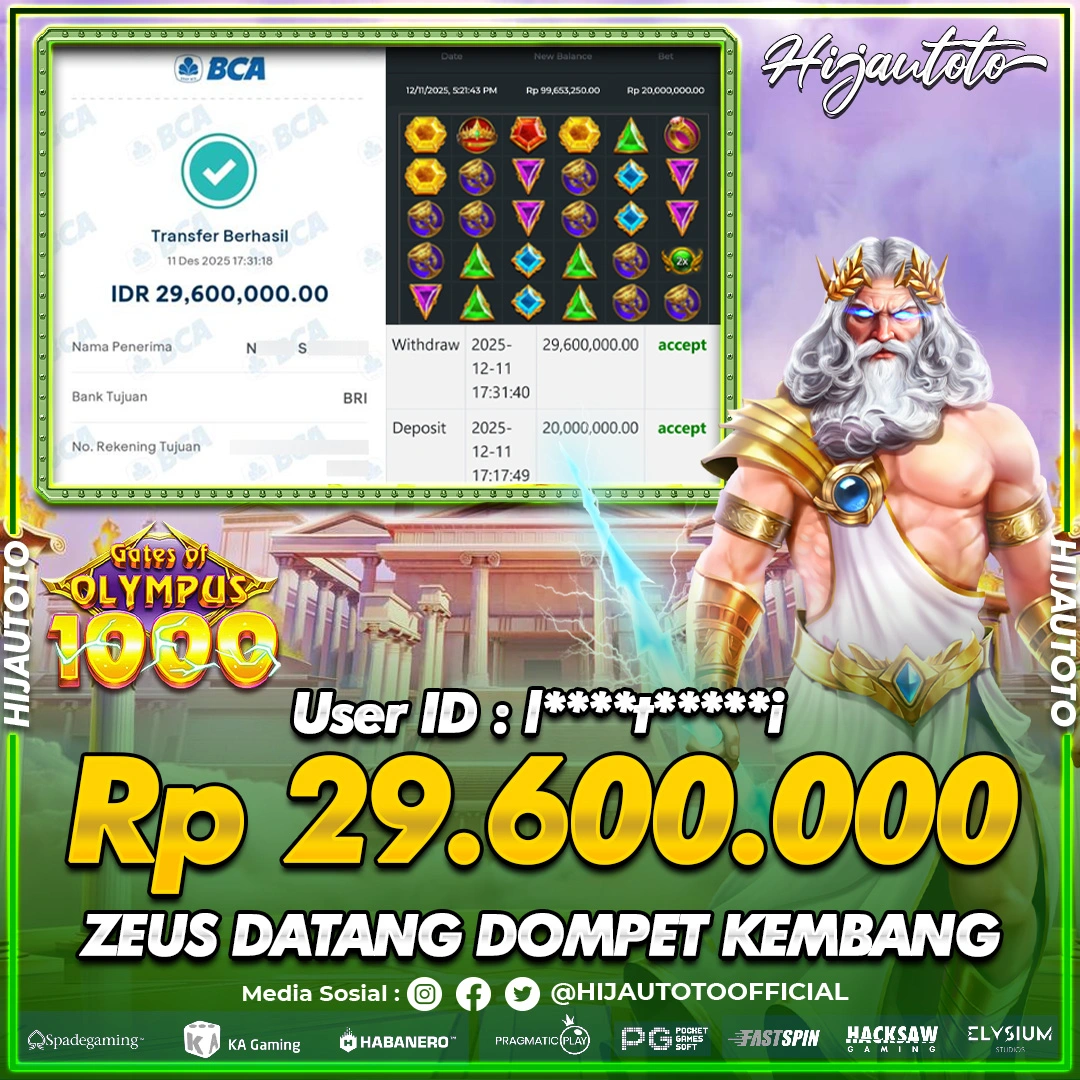 Selamat Kepada Member HIJAUTOTO M******L Telah Jackpot Di SLOT GATES OF OLYMPUS 1000