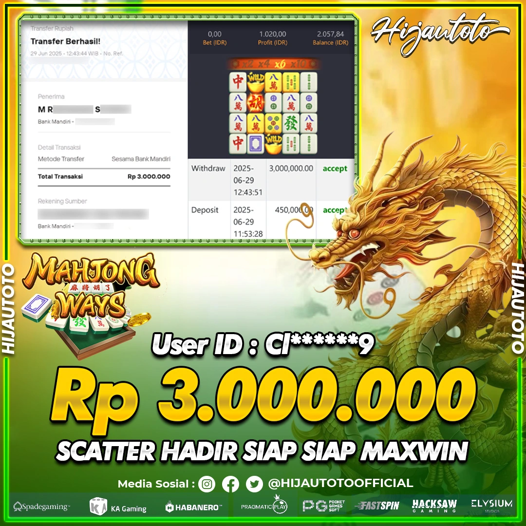 Selamat Kepada Member HIJAUTOTO CL******9 Telah Jackpot Di SLOT MAHJONG WAYS