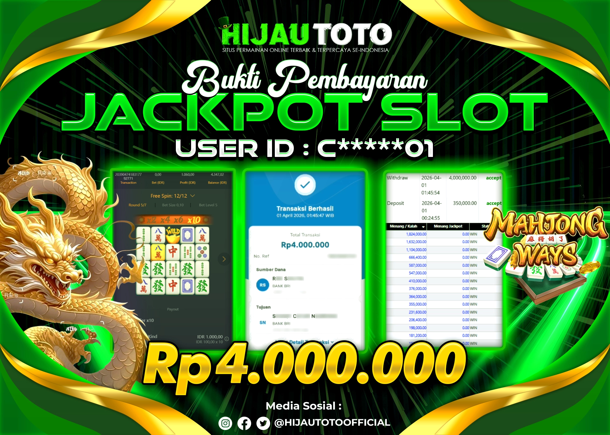 Bergabung dengan HIJAUTOTO sangat mudah dan cepat. Cukup lakukan pendaftaran dengan data lengkap, lakukan deposit minimal Rp5.000 melalui berbagai metode termasuk QRIS, dan mulai bertaruh dengan minimal taruhan Rp100. Dapatkan juga bonus new member 100% untuk modal bermain lebih besar.