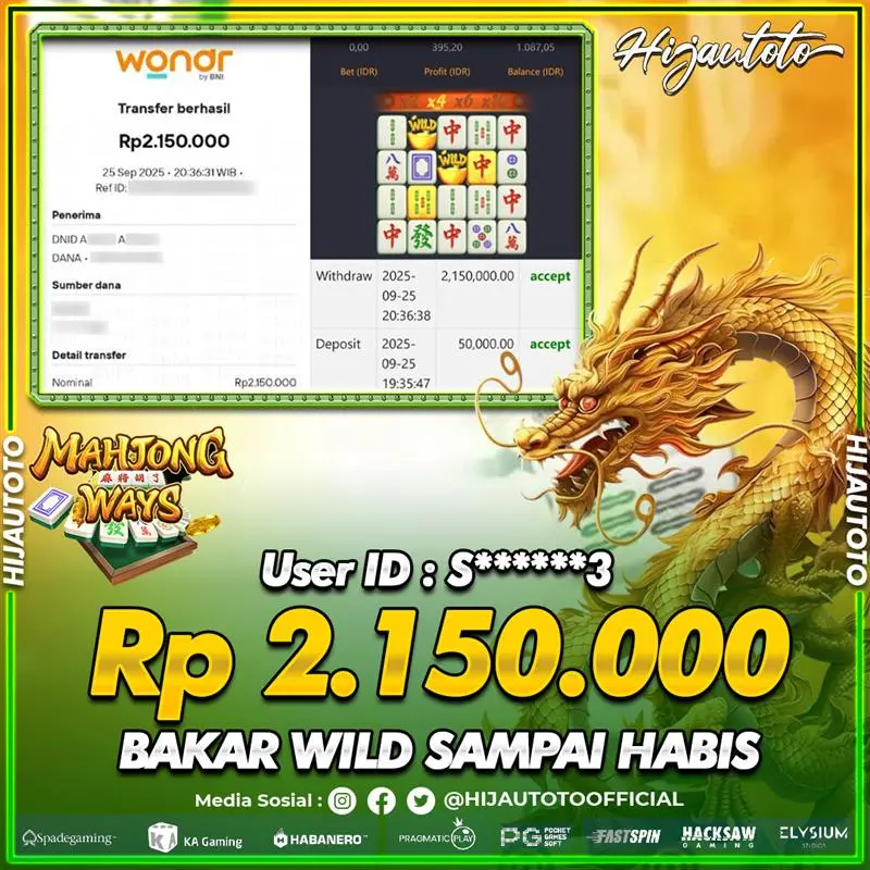 Selamat Kepada Member HIJAUTOTO L******G Telah Jackpot Di SLOT MAHJONG WAYS
