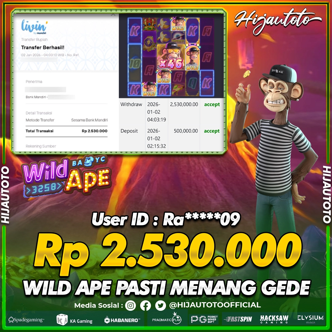 Selamat Kepada Member HIJAUTOTO RA*****09 Telah Jackpot Di SLOT WILD APE