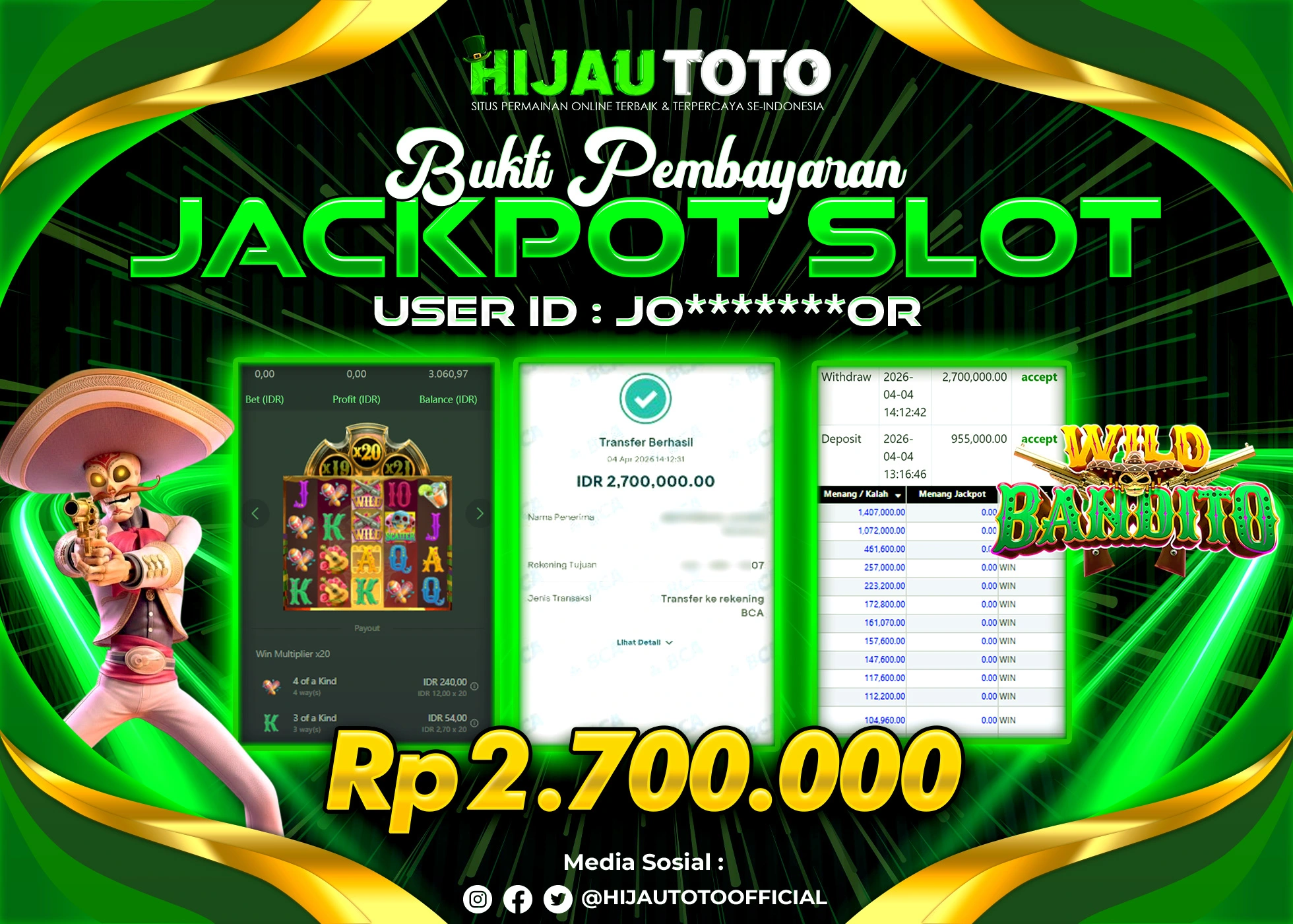 Selamat Kepada Member HIJAUTOTO JO*******OR Telah Jackpot Di SLOT WILD BANDITO