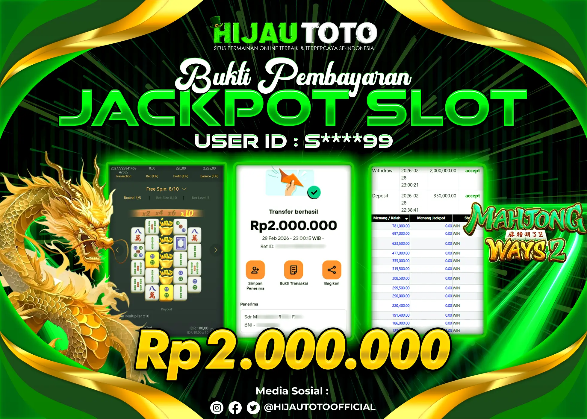 Selamat Kepada Member HIJAUTOTO S*****9 Telah Jackpot Di SLOT MAHJONG WAYS 2