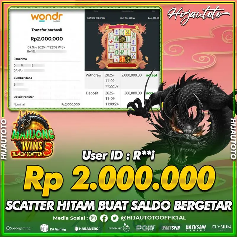 Selamat Kepada Member HIJAUTOTO R*** Telah Jackpot Di SLOT MAHJONG WINS 3 BLACK SCATTER