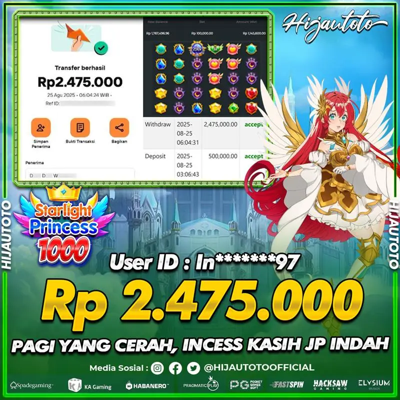 Selamat Kepada Member HIJAUTOTO IN*******97 Telah Jackpot Di SLOT STARLIGHT PRINCESS 1000