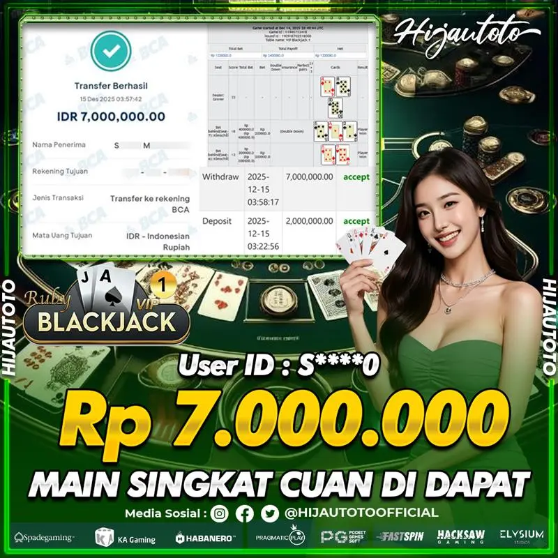 Selamat Kepada Member HIJAUTOTO S****0 Telah Jackpot Di SLOT BLACKJACK VIP 1 RUBY