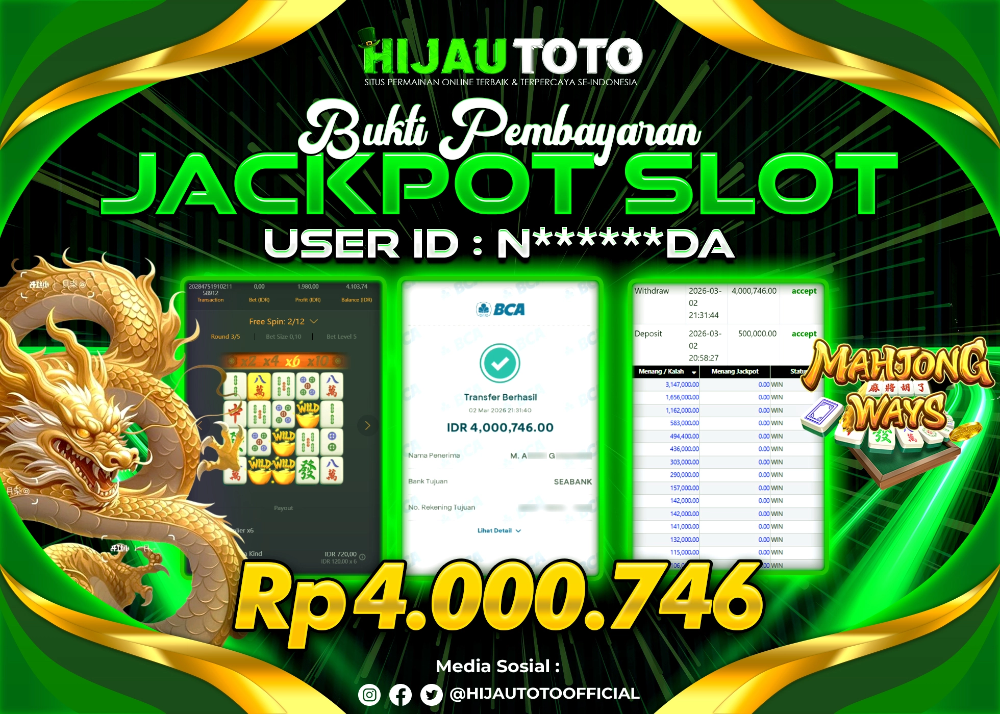 Selamat datang di HIJAUTOTO, tempatnya seru-seruan dan cuan besar! Mulai main cukup dengan modal Rp5.000 aja, taruhan super murah dari Rp100 perak! Mau main slot yang penuh warna? Atau togel dari 20 pasaran paling hits? Atau mungkin tembak ikan yang bikin deg-degan? Tenang, ada juga taruhan bola, sabung ayam, dan live casino yang bikin suasana makin hidup! Daftar sekarang dan dapetin bonus new member 100% langsung, biar modalmu makin tebal. Deposit gampang banget, bisa pakai QRIS, dan kalau butuh bantuan, customer service kita siap 24 jam nonstop. Jadi, tunggu apa lagi? Yuk, gabung dan bawa pulang kemenangannya cuma di HIJAUTOTO!