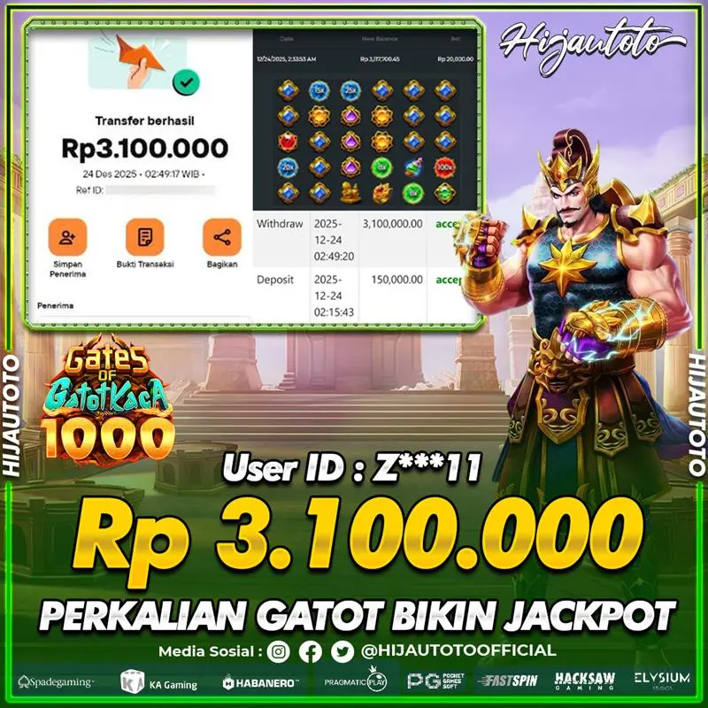 Selamat Kepada Member HIJAUTOTO Z****1 Telah Jackpot Di SLOT GATES OF GATOTKACA 1000