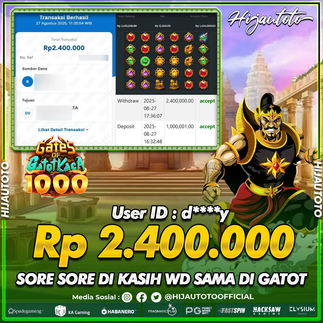 Selamat Kepada Member HIJAUTOTO D****Y Telah Jackpot Di SLOT GATES OF GATOTKACA 1000