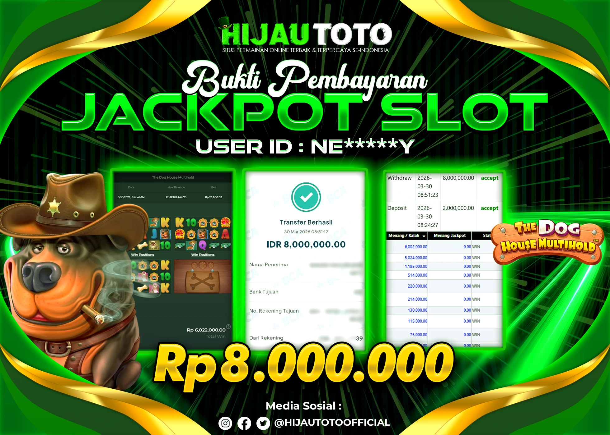 Selamat Kepada Member HIJAUTOTO NE*****Y Telah Jackpot Di SLOT THE HAUSE MULTIHOLD