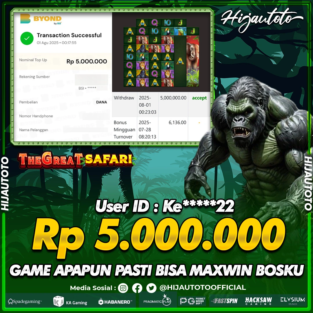 Selamat Kepada Member HIJAUTOTO KE*****22 Telah Jackpot Di SLOT THE GREAT SAFARI