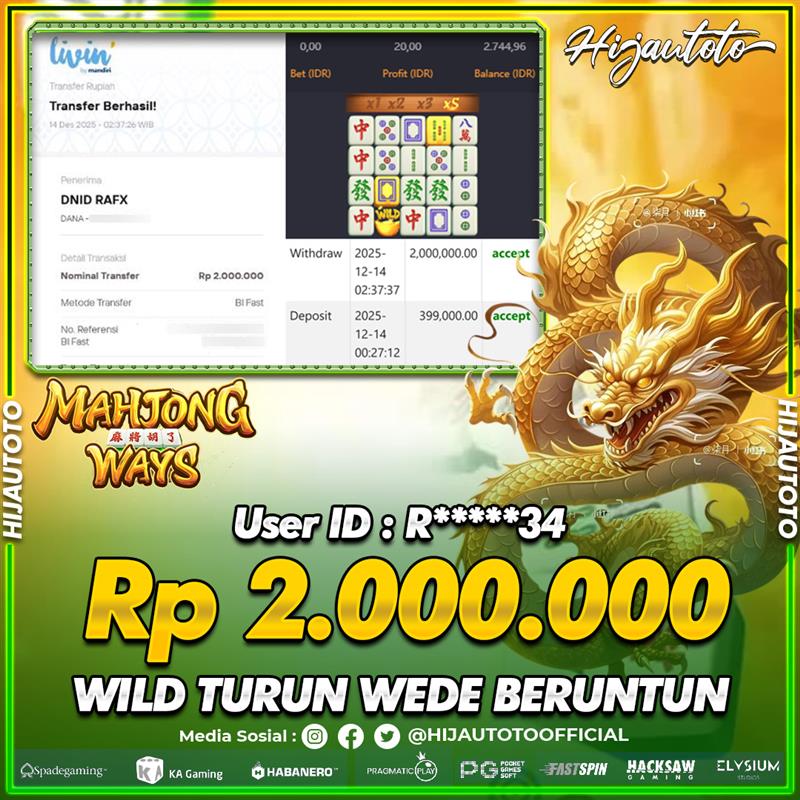 Selamat Kepada Member HIJAUTOTO R*****34 Telah Jackpot Di SLOT MAHJONG WAYS