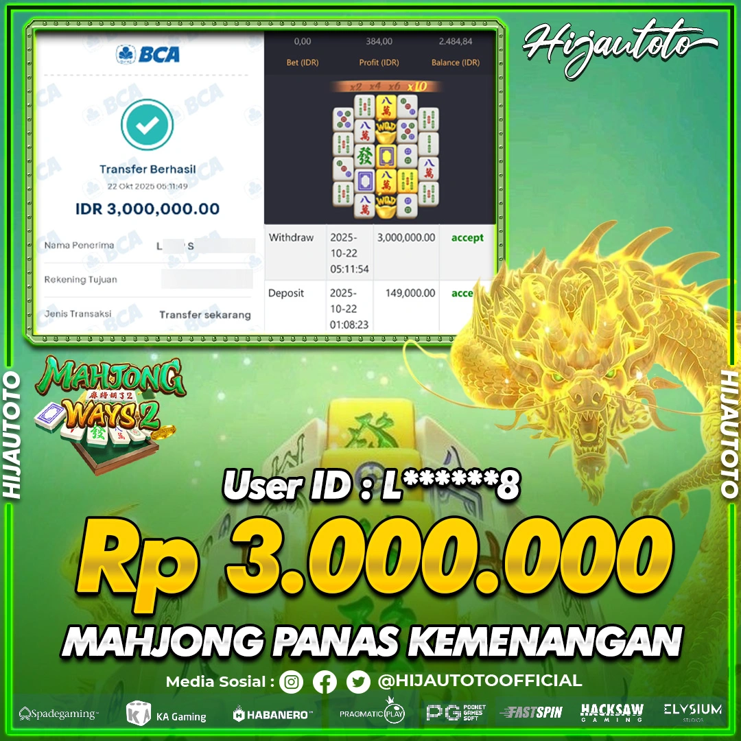 Selamat Kepada Member HIJAUTOTO L******8 Telah Jackpot Di SLOT MAHJONG WAYS 2