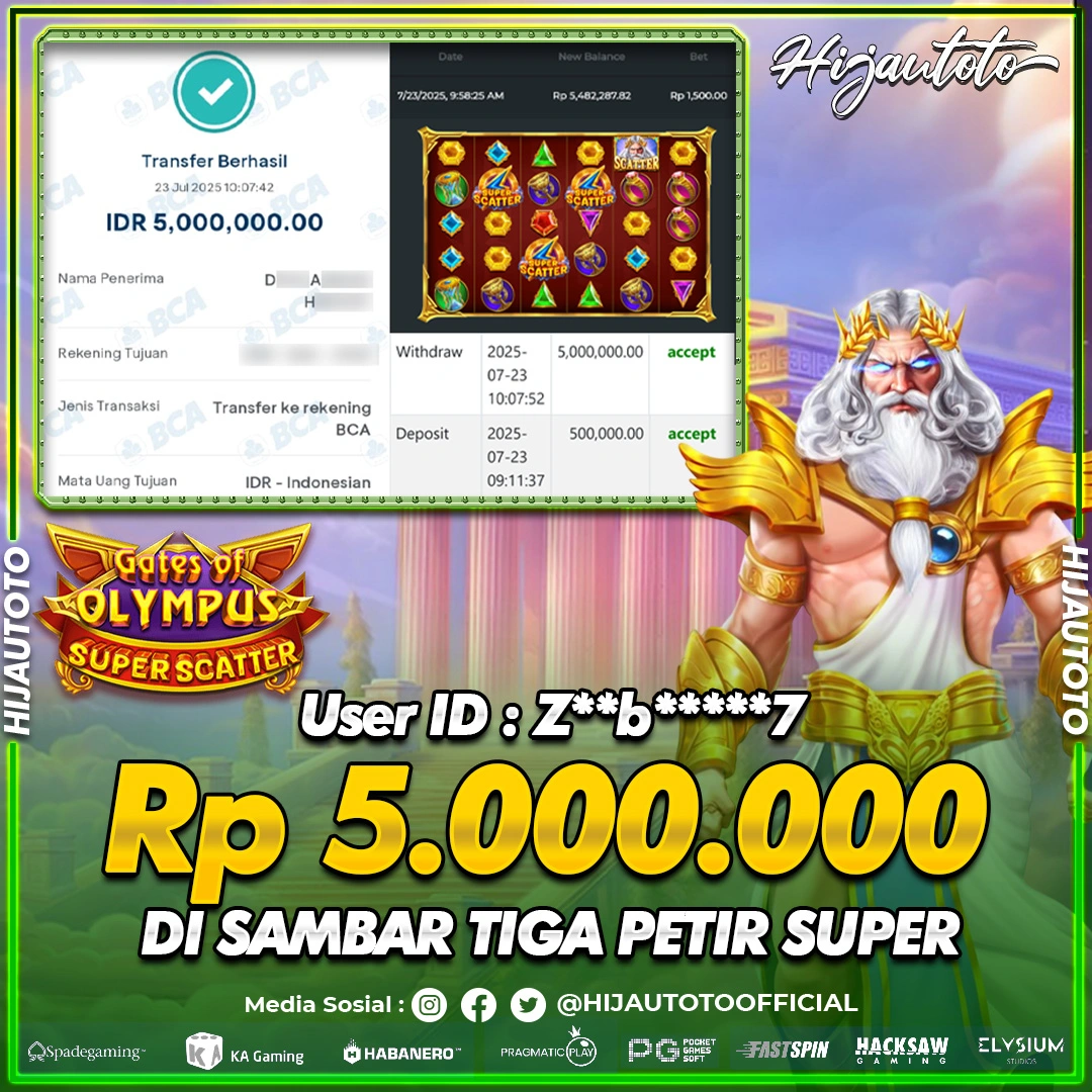 Selamat Kepada Member HIJAUTOTO Z**B*****7 Telah Jackpot Di SLOT GATES OF OLYMPUS SUPER SCATTER