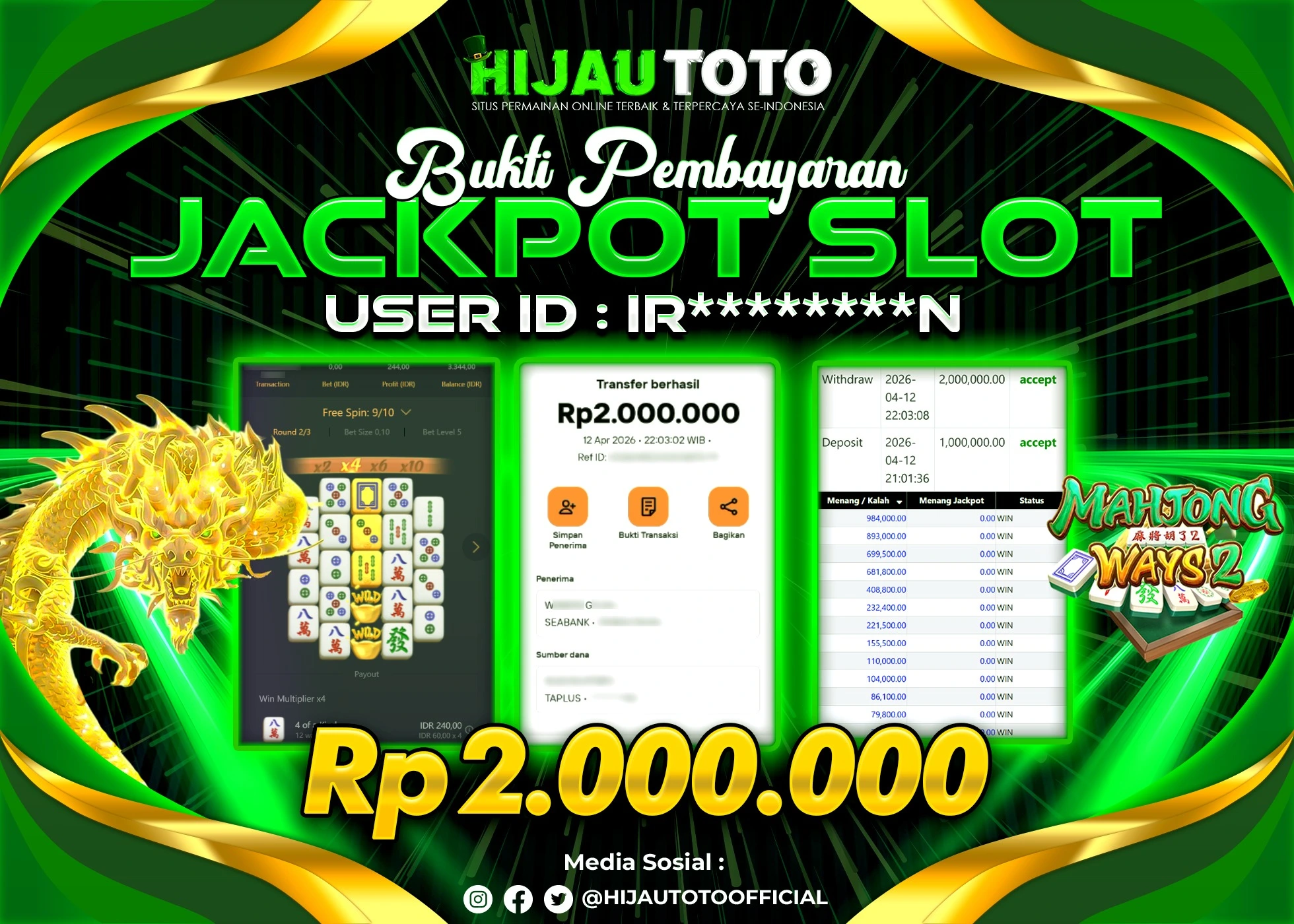 Bergabung dengan HIJAUTOTO sangat mudah dan cepat. Cukup lakukan pendaftaran dengan data lengkap, lakukan deposit minimal Rp5.000 melalui berbagai metode termasuk QRIS, dan mulai bertaruh dengan minimal taruhan Rp100. Dapatkan juga bonus new member 100% untuk modal bermain lebih besar.
