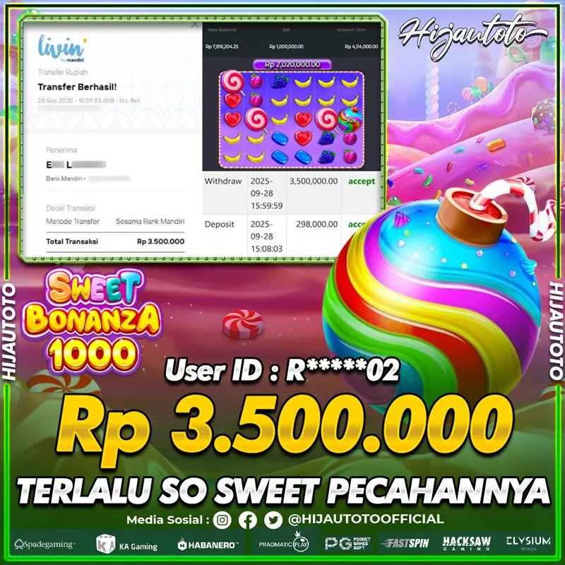 Selamat Kepada Member HIJAUTOTO R*****02 Telah Jackpot Di SLOT SWEET BONANZA 1000