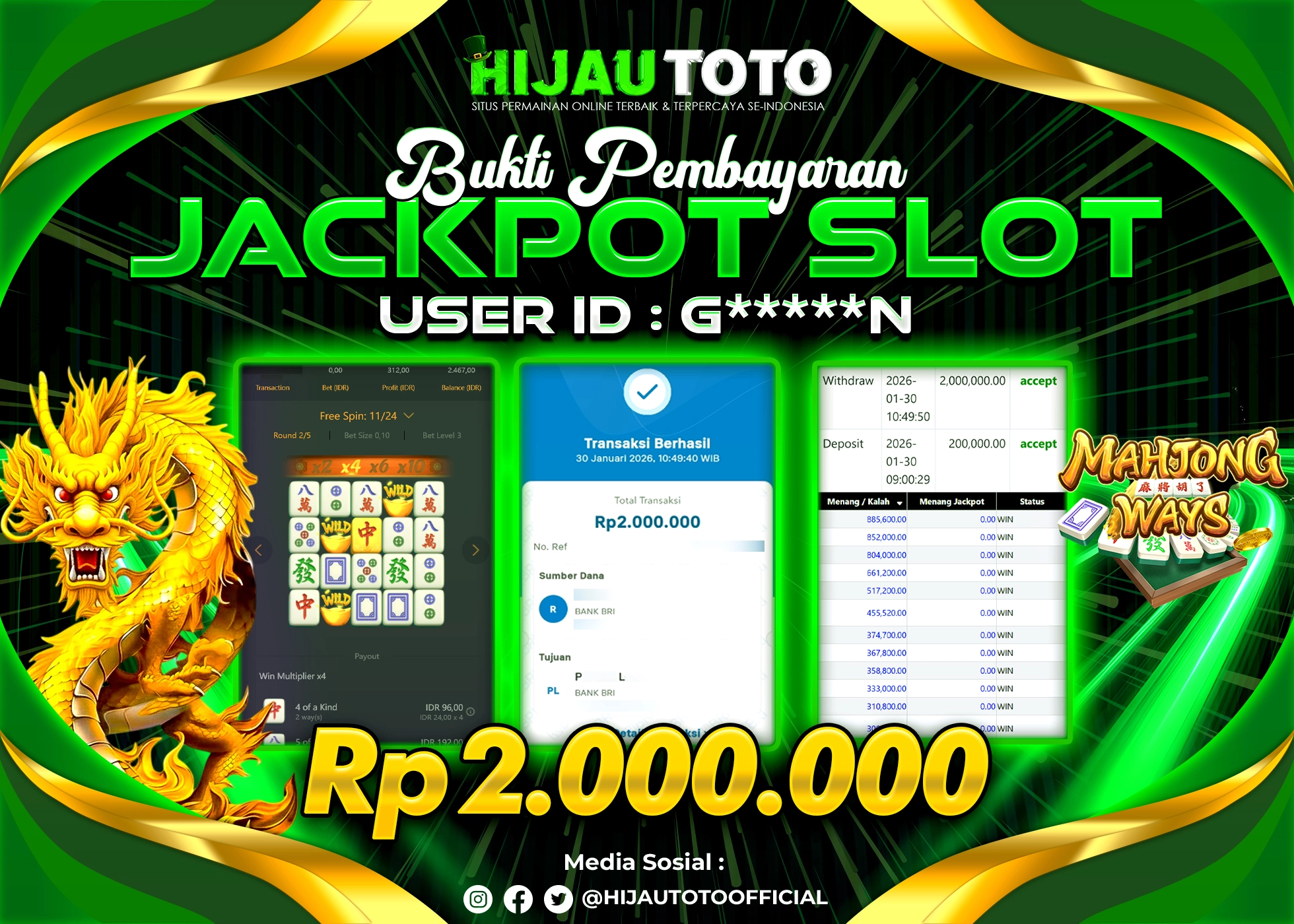 Selamat Kepada Member HIJAUTOTO S*****9 Telah Jackpot Di SLOT MAHJONG WAYS 2