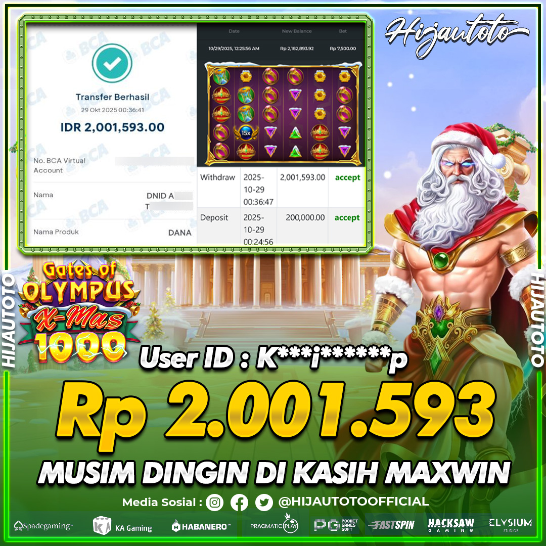 Selamat Kepada Member HIJAUTOTO K***I******P Telah Jackpot Di SLOT GATES OF OLYMPUS X MAS 1000