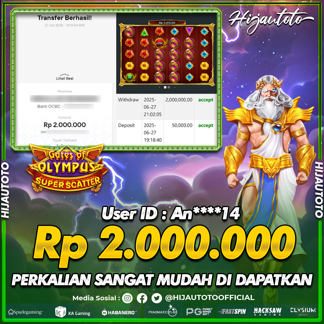 Selamat Kepada Member HIJAUTOTO AN****14 Telah Jackpot Di SLOT GATES OF OLYMPUS SUPER SCATTER