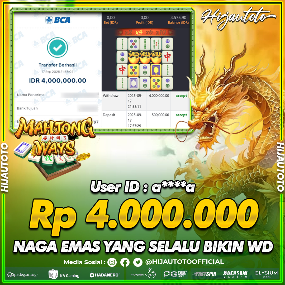 Selamat Kepada Member HIJAUTOTO A****A Telah Jackpot Di SLOT MAHJONG WAYS
