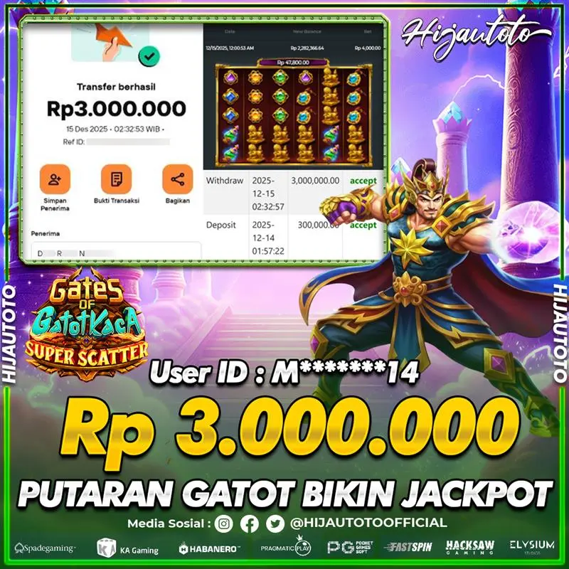 Selamat Kepada Member HIJAUTOTO M*******14 Telah Jackpot Di SLOT GATES OF GATOT KACA SUPER SCATTER