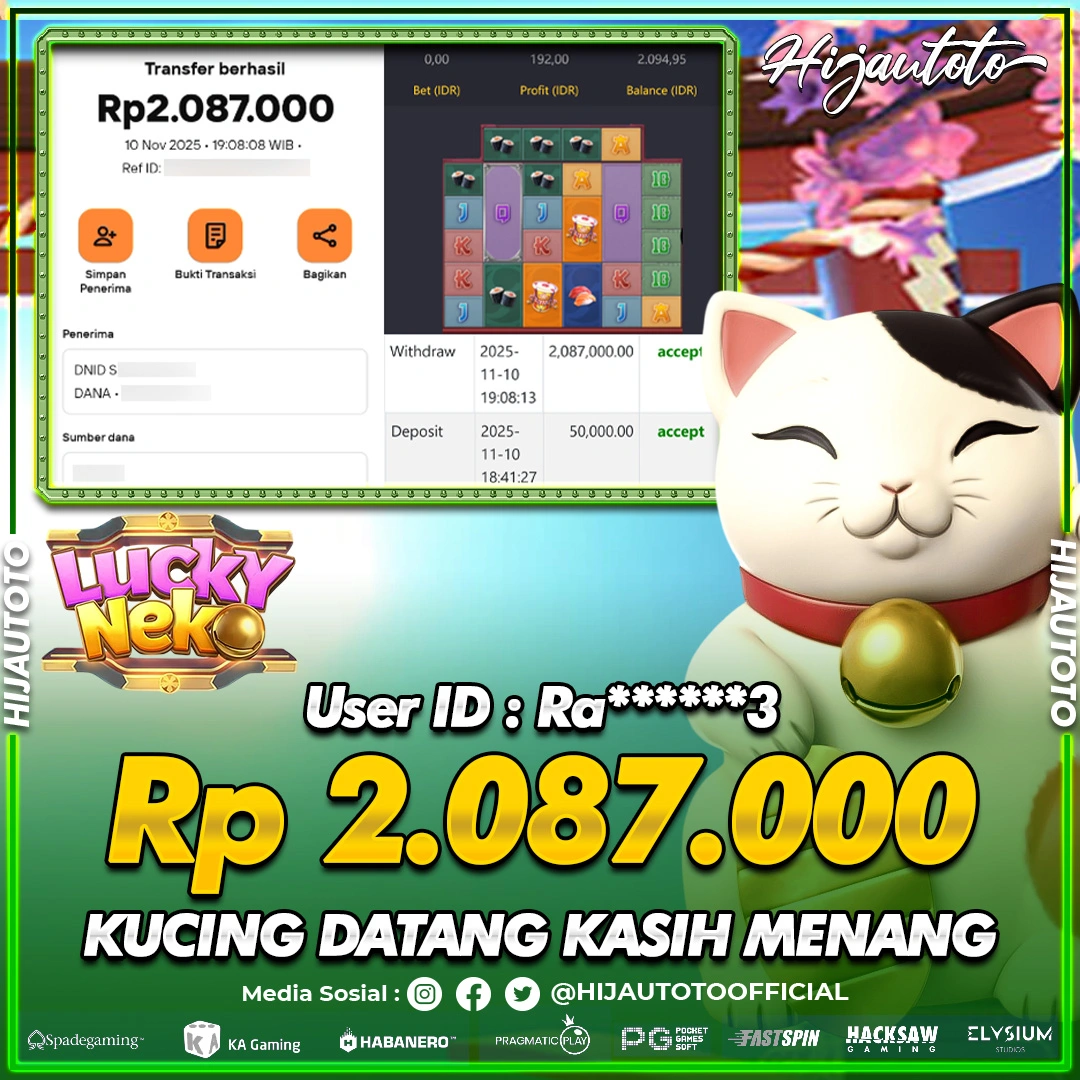 Selamat Kepada Member HIJAUTOTO RA******3 Telah Jackpot Di SLOT LUCKY NEKO