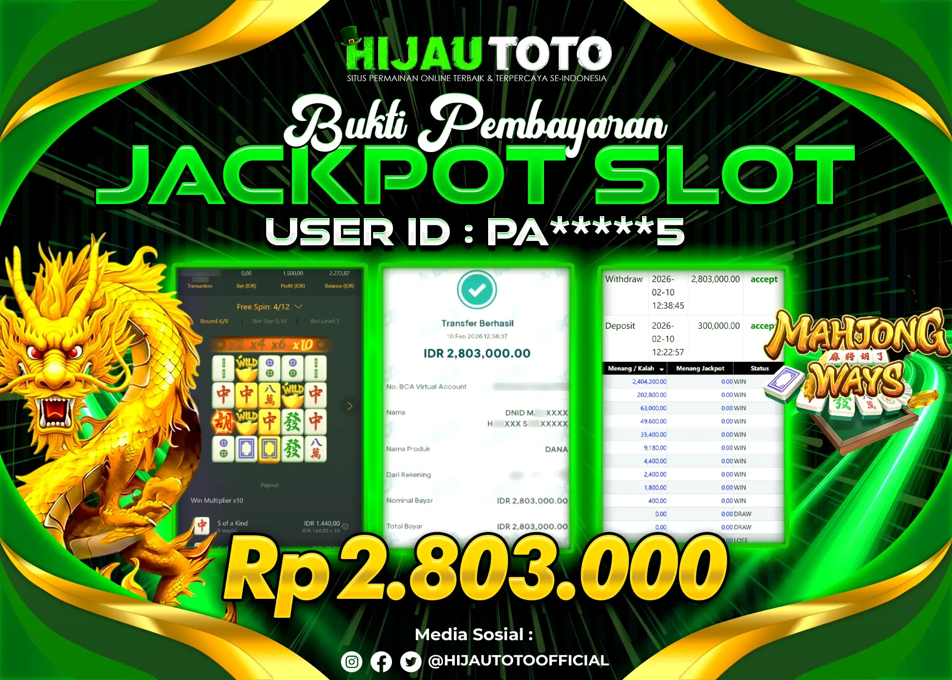 Selamat datang di HIJAUTOTO, tempatnya seru-seruan dan cuan besar! Mulai main cukup dengan modal Rp5.000 aja, taruhan super murah dari Rp100 perak! Mau main slot yang penuh warna? Atau togel dari 20 pasaran paling hits? Atau mungkin tembak ikan yang bikin deg-degan? Tenang, ada juga taruhan bola, sabung ayam, dan live casino yang bikin suasana makin hidup! Daftar sekarang dan dapetin bonus new member 100% langsung, biar modalmu makin tebal. Deposit gampang banget, bisa pakai QRIS, dan kalau butuh bantuan, customer service kita siap 24 jam nonstop. Jadi, tunggu apa lagi? Yuk, gabung dan bawa pulang kemenangannya cuma di HIJAUTOTO!