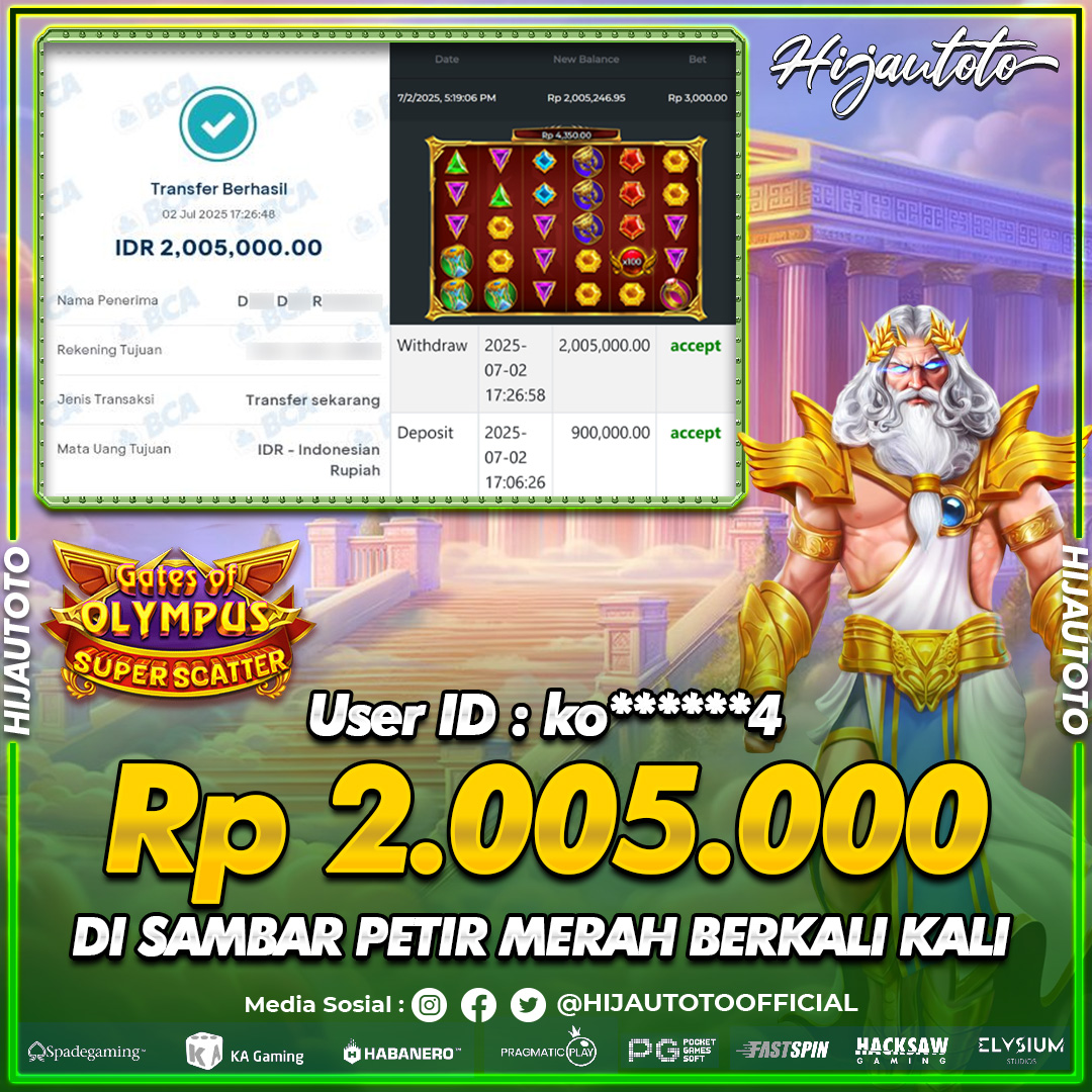 Selamat Kepada Member HIJAUTOTO KO******4 Telah Jackpot Di SLOT GATES OF OLYMPUS SUPER SCATTER