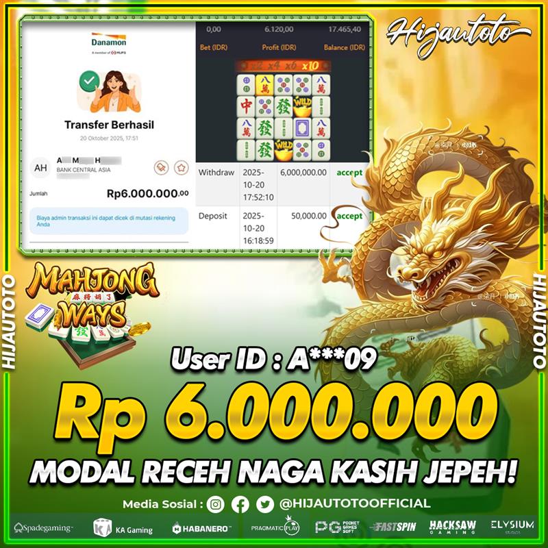 Selamat Kepada Member HIJAUTOTO A****9 Telah Jackpot Di SLOT MAHJONG WAYS