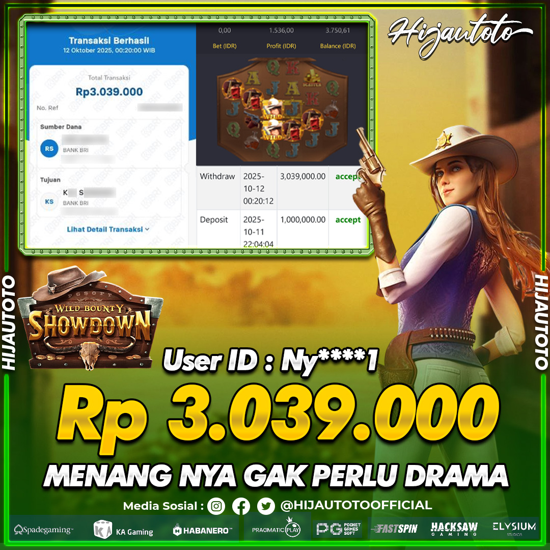 Selamat Kepada Member HIJAUTOTO NY****1 Telah Jackpot Di SLOT WILD BOUNTY SHOWDOWN