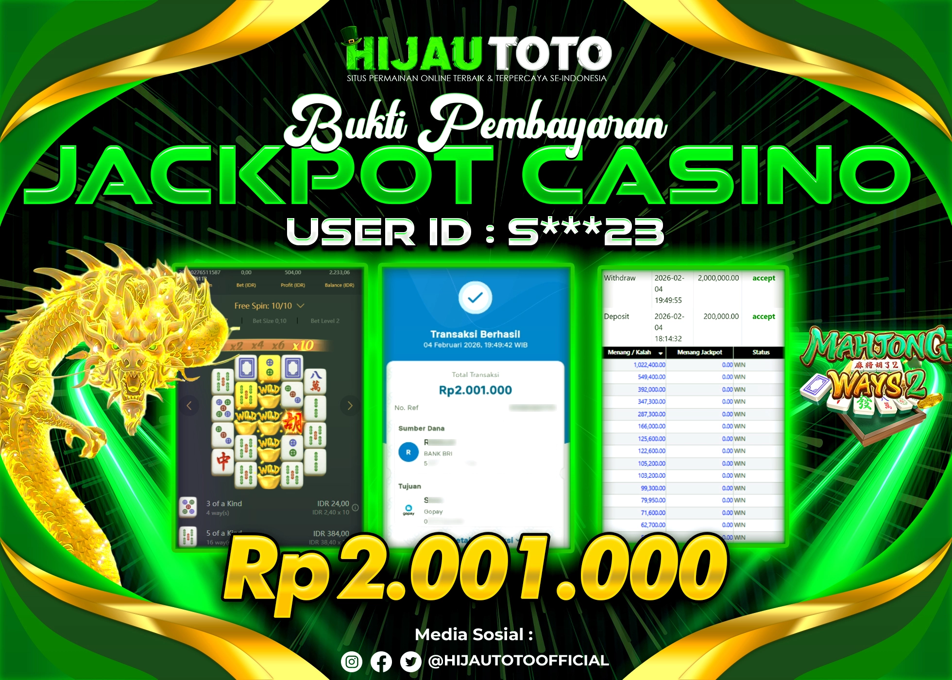 Selamat datang di HIJAUTOTO, tempatnya seru-seruan dan cuan besar! Mulai main cukup dengan modal Rp5.000 aja, taruhan super murah dari Rp100 perak! Mau main slot yang penuh warna? Atau togel dari 20 pasaran paling hits? Atau mungkin tembak ikan yang bikin deg-degan? Tenang, ada juga taruhan bola, sabung ayam, dan live casino yang bikin suasana makin hidup! Daftar sekarang dan dapetin bonus new member 100% langsung, biar modalmu makin tebal. Deposit gampang banget, bisa pakai QRIS, dan kalau butuh bantuan, customer service kita siap 24 jam nonstop. Jadi, tunggu apa lagi? Yuk, gabung dan bawa pulang kemenangannya cuma di HIJAUTOTO!