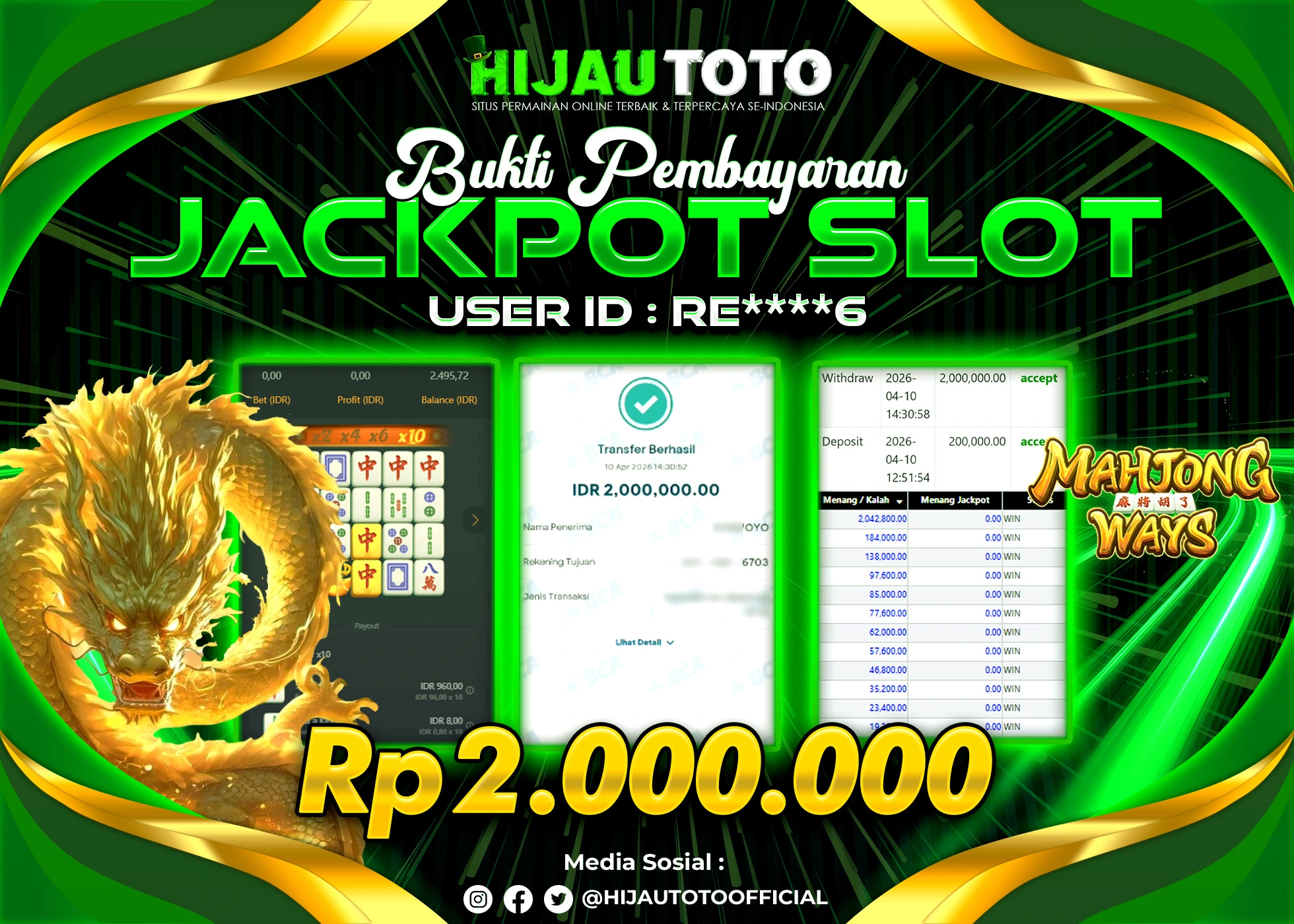 Bergabung dengan HIJAUTOTO sangat mudah dan cepat. Cukup lakukan pendaftaran dengan data lengkap, lakukan deposit minimal Rp5.000 melalui berbagai metode termasuk QRIS, dan mulai bertaruh dengan minimal taruhan Rp100. Dapatkan juga bonus new member 100% untuk modal bermain lebih besar.