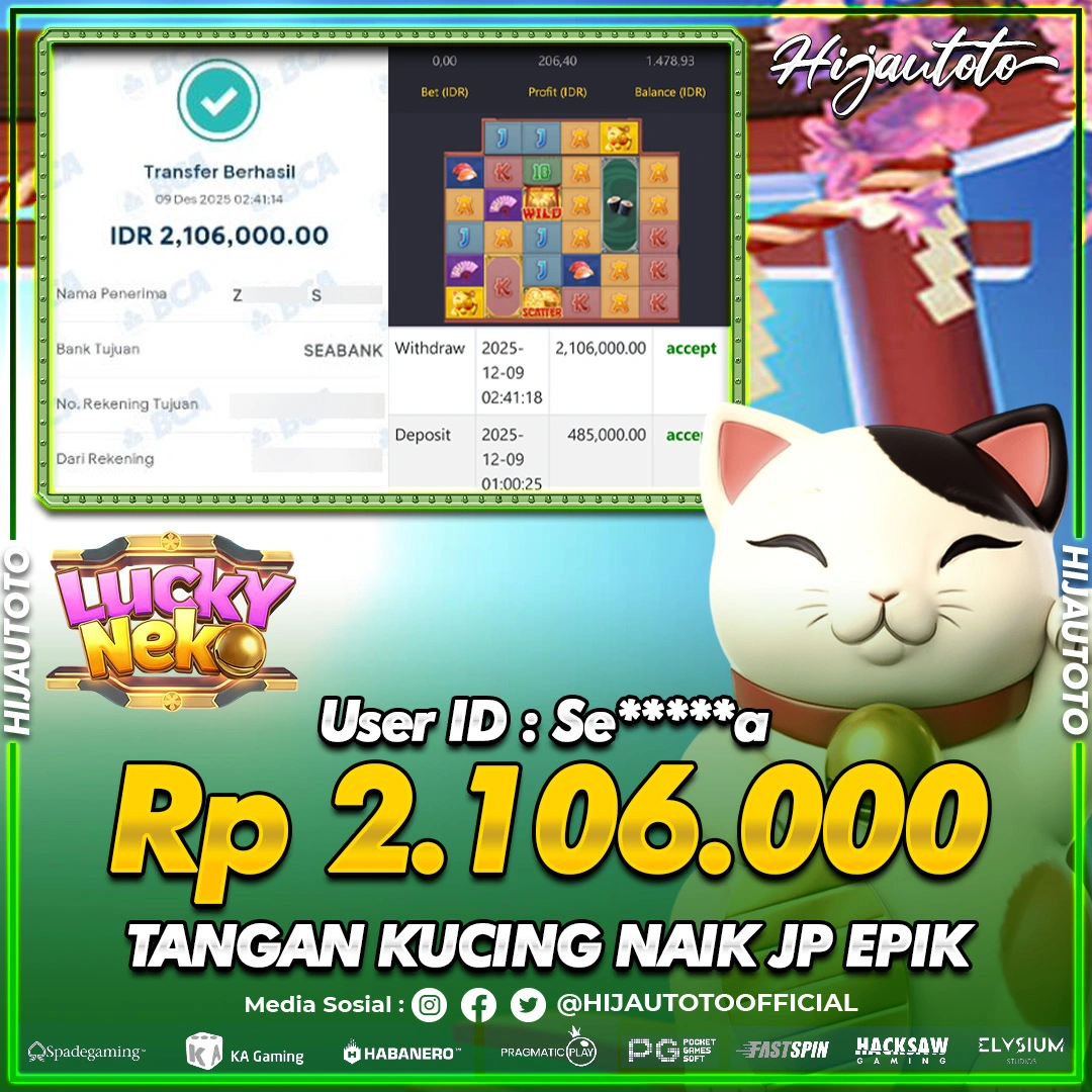 Selamat Kepada Member HIJAUTOTO SE*****A Telah Jackpot Di SLOT LUCKY NEKO