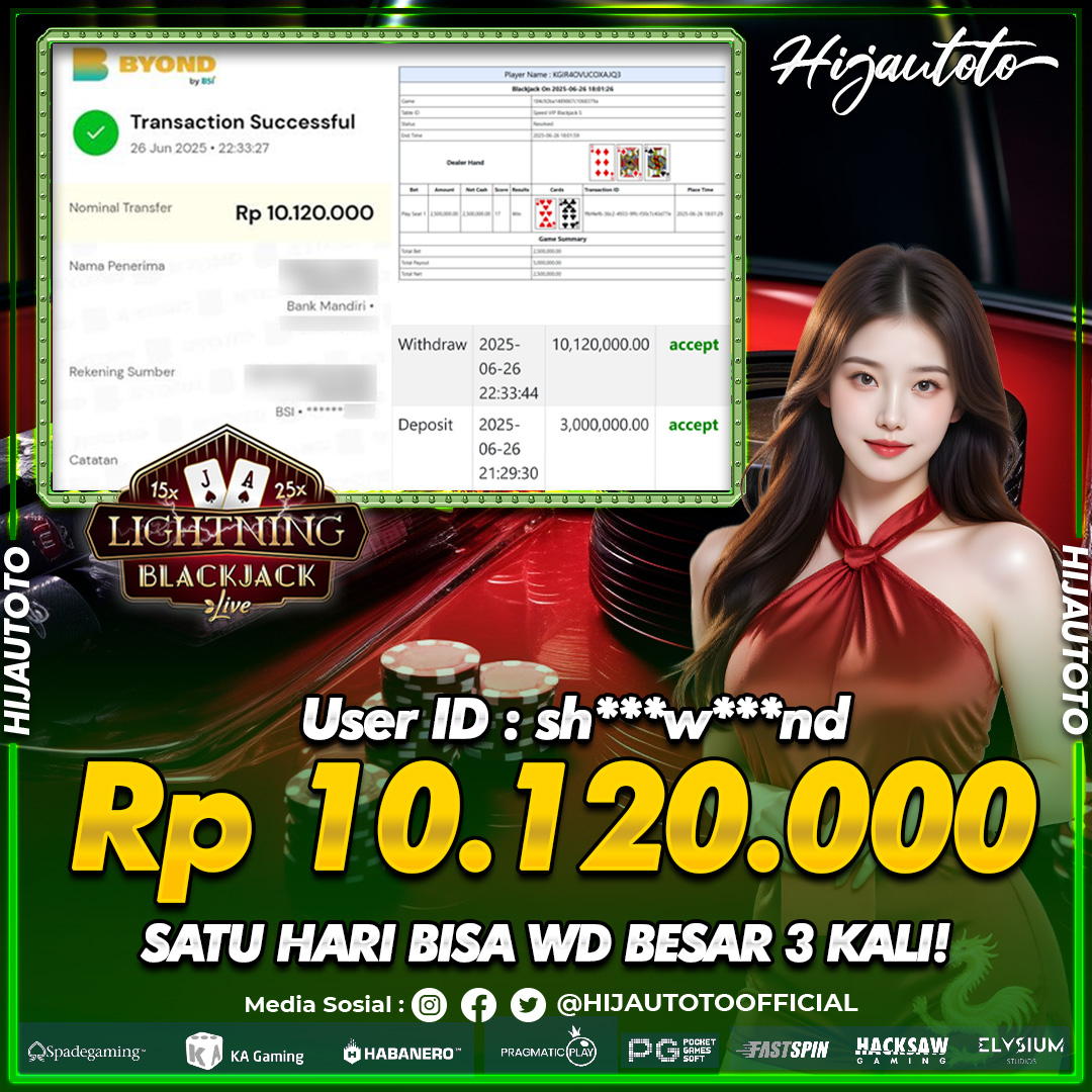 Selamat datang di HIJAUTOTO, tempatnya seru-seruan dan cuan besar! Mulai main cukup dengan modal Rp5.000 aja, taruhan super murah dari Rp100 perak! Mau main slot yang penuh warna? Atau togel dari 20 pasaran paling hits? Atau mungkin tembak ikan yang bikin deg-degan? Tenang, ada juga taruhan bola, sabung ayam, dan live casino yang bikin suasana makin hidup! Daftar sekarang dan dapetin bonus new member 100% langsung, biar modalmu makin tebal. Deposit gampang banget, bisa pakai QRIS, dan kalau butuh bantuan, customer service kita siap 24 jam nonstop. Jadi, tunggu apa lagi? Yuk, gabung dan bawa pulang kemenangannya cuma di HIJAUTOTO!